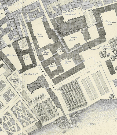 Detail, showing the Middle Temple, of a copy of the Map of London, 1677, by John Ogilby. Copied by John Locke, Treasurer, 1871
