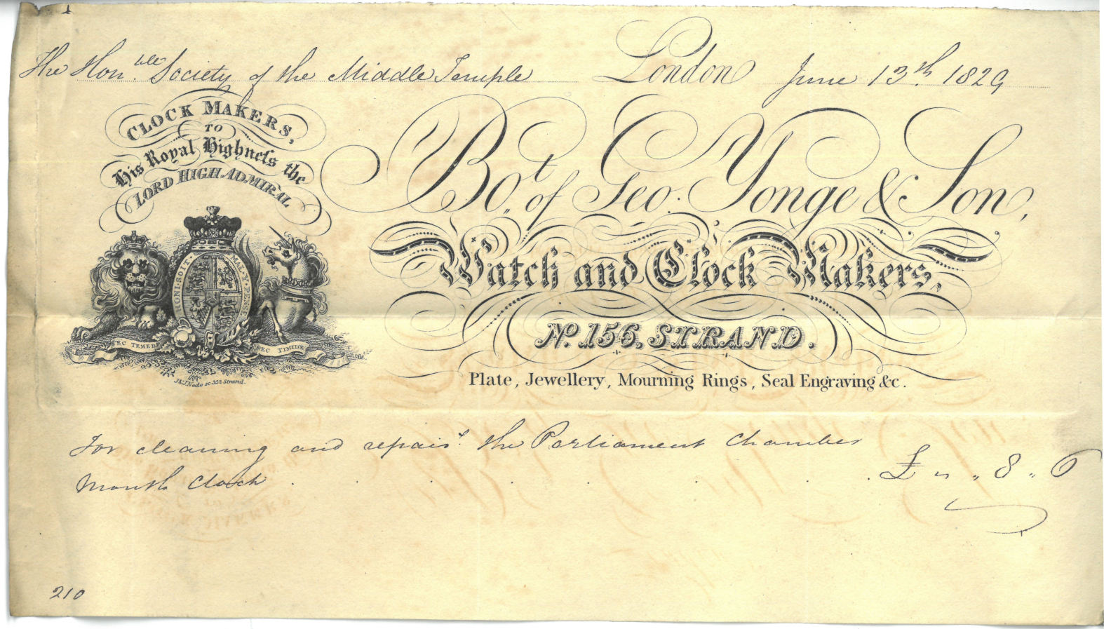 Receipt showing £8s 9p paid to George Yonge & Son for cleaning and repairing a month-clock in the old Parliament Chamber, 13th June 1829 (MT/2/TUT/79)