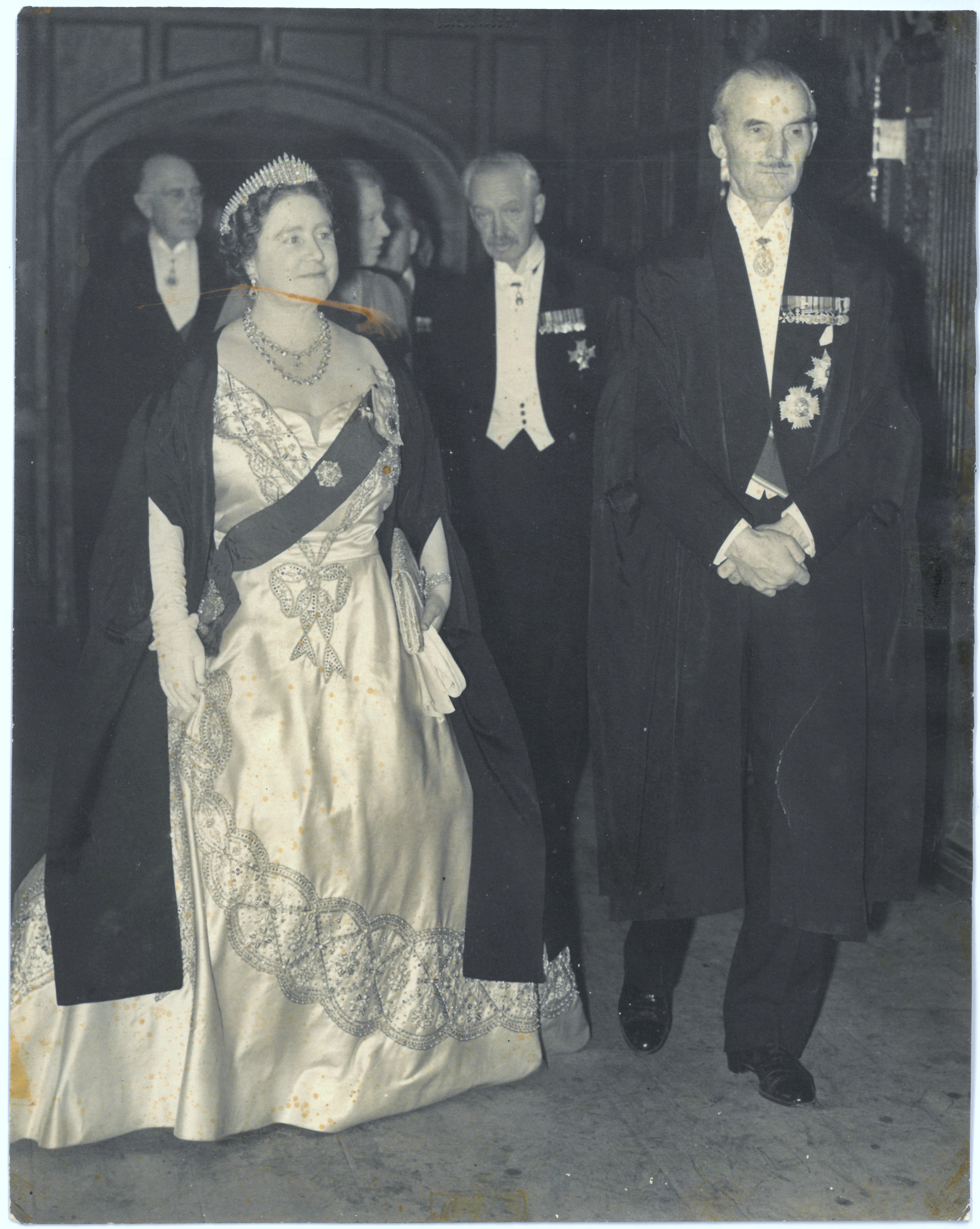 Items of particular relevance to the Inn include those dating to Sir Henry’s Deputy Treausrership at the Inn. One of the most notable occasions during his tenure was the re-opening of Hall in July 1949, following its restoration after the Second World War. The occasion was first commemorated with a visit from the Queen Elizabeth on 6 July, and later in the month a Joint Bench Dinner attended by both the King and the Queen. There are a number of photographs in the archive relating to the two events, some depicting Sir Henry escorting the Queen from the Benchers’ Entrance to Hall for its re-opening ceremony, as well as him standing alongside the Queen, in ceremonial dress, before entering Hall for the dinner.