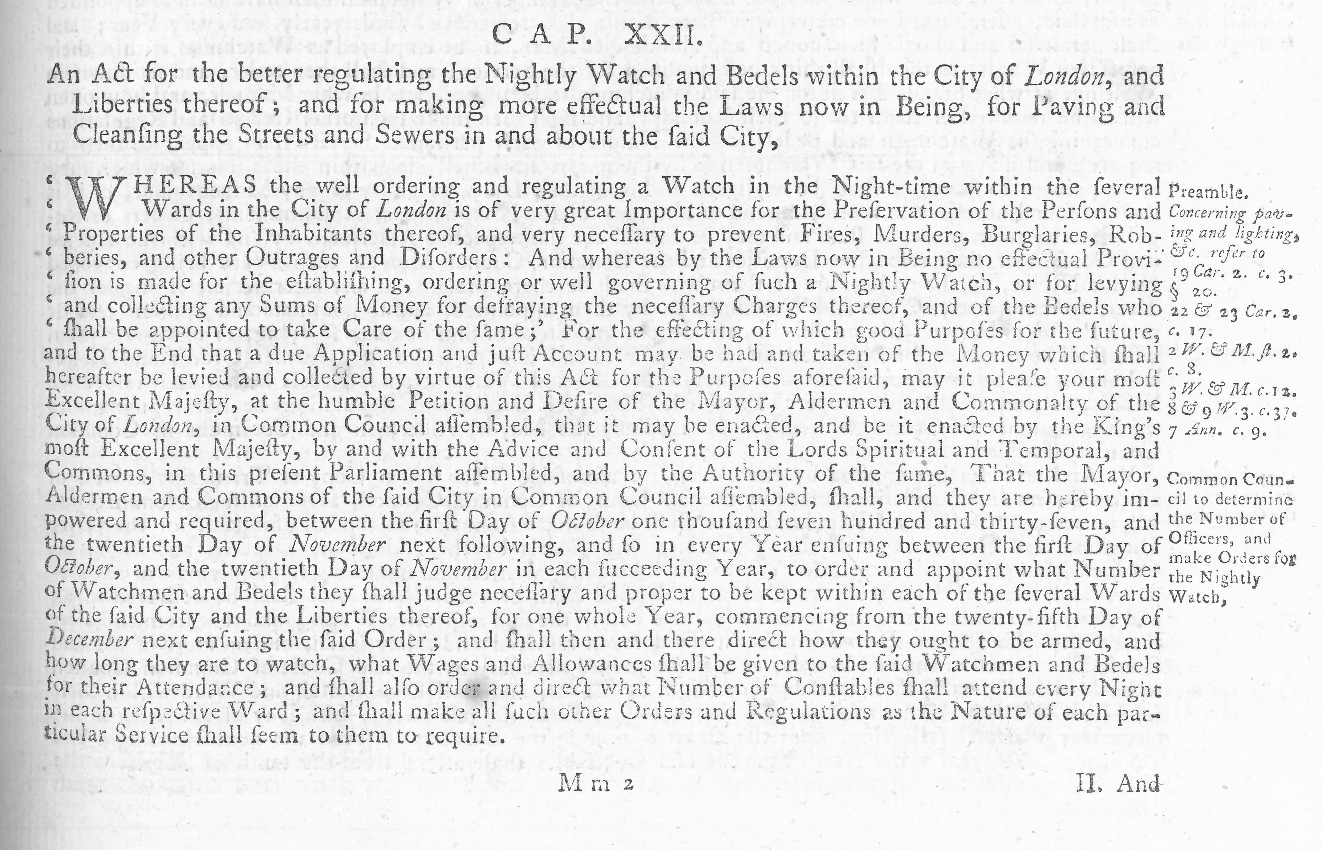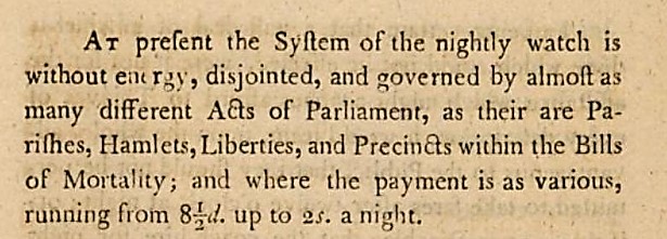 Two further legislative reforms took place in the early and latter years of the eighteenth-century. The 10th Act of George II from 1737 (10 Geo II, c. 22) re-enacted Elizabeth I’s original act of 1585, but enlarged its powers. New instructions for a night watch were established, whereby the Common Council of the city would oversee its creation and governance, and were responsible for levying rates to pay for it. The night watch could act in the absence of the constables when keeping watch and ward, and enjoyed the same privileges of apprehending all night-walkers, malefactors, rogues, vagabonds, and disorderly people they ‘suspected of evil designs’.