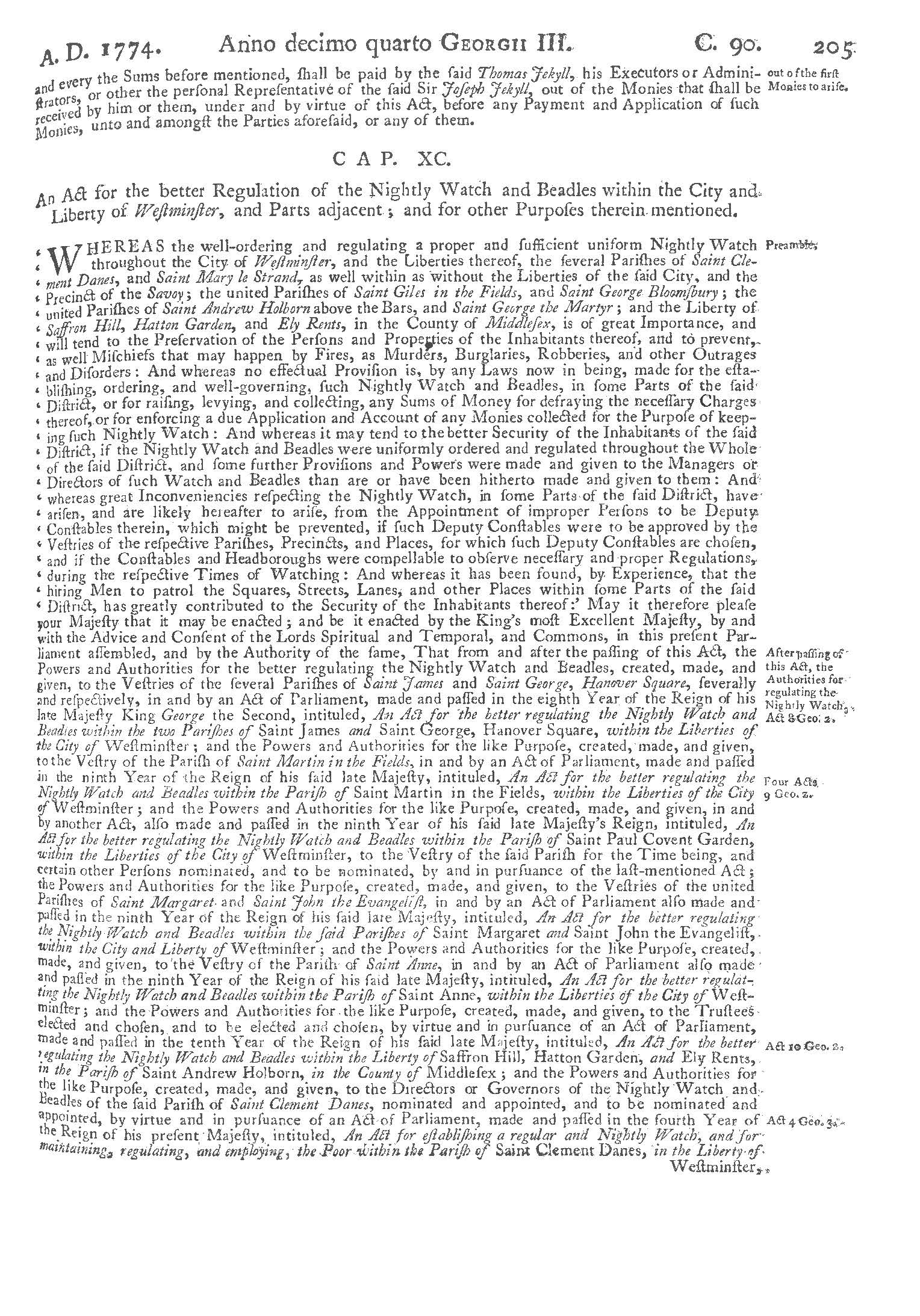 The second Act, which was passed in 1777 (14 Geo III, c. 90), took elements of the 1585 and 1737 legislation – in effect repealing them both – and outlined, clearly, the logistical elements of the Watch: the annual number of watchmen; their wages; how they were to be armed and accommodated. The Act went on to detail a list of duties and how they were to conduct themselves whilst on duty. However, the watchmen developed reputations for being untrustworthy and, themselves, agents of crime. The general consensus was that reform was needed.