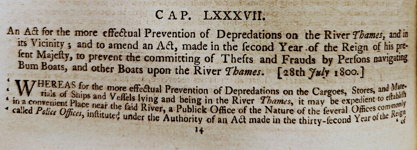 Depredations on the Thames Act 1800 (3 Geo III. C. 87) received Royal Assent on 28th July 1800 and set out the regulations on how the newly increased, and now formally established, River Police were to operate; reporting directly to the Home Secretary.