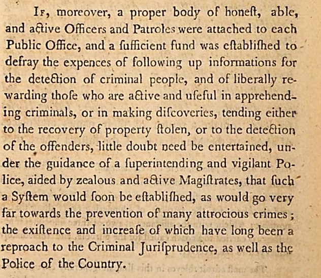 His comments follow those of Henry Fielding’s, whose work Colquhoun greatly admired; it summarised commonplace criminal offenses in London, and went on to provide suggestions on how to prevent them.