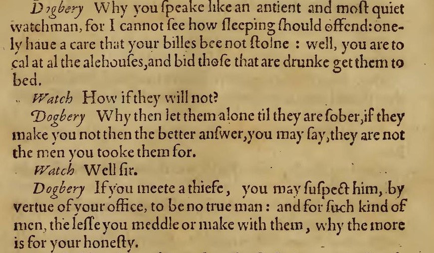 Here, Dogberry instructs the watch to make sure that those who are drunk get to bed and be left. He goes on to outline that they must make no noise when on duty; to ensure that nurses are not woken while the children in their care are crying, and to offend no-one. Dogberry confuses the word ‘sensible’ with ‘senseless’, enforcing the stereotype that the watchmen’s philosophy towards peace-keeping is lax at best and senseless at worst.