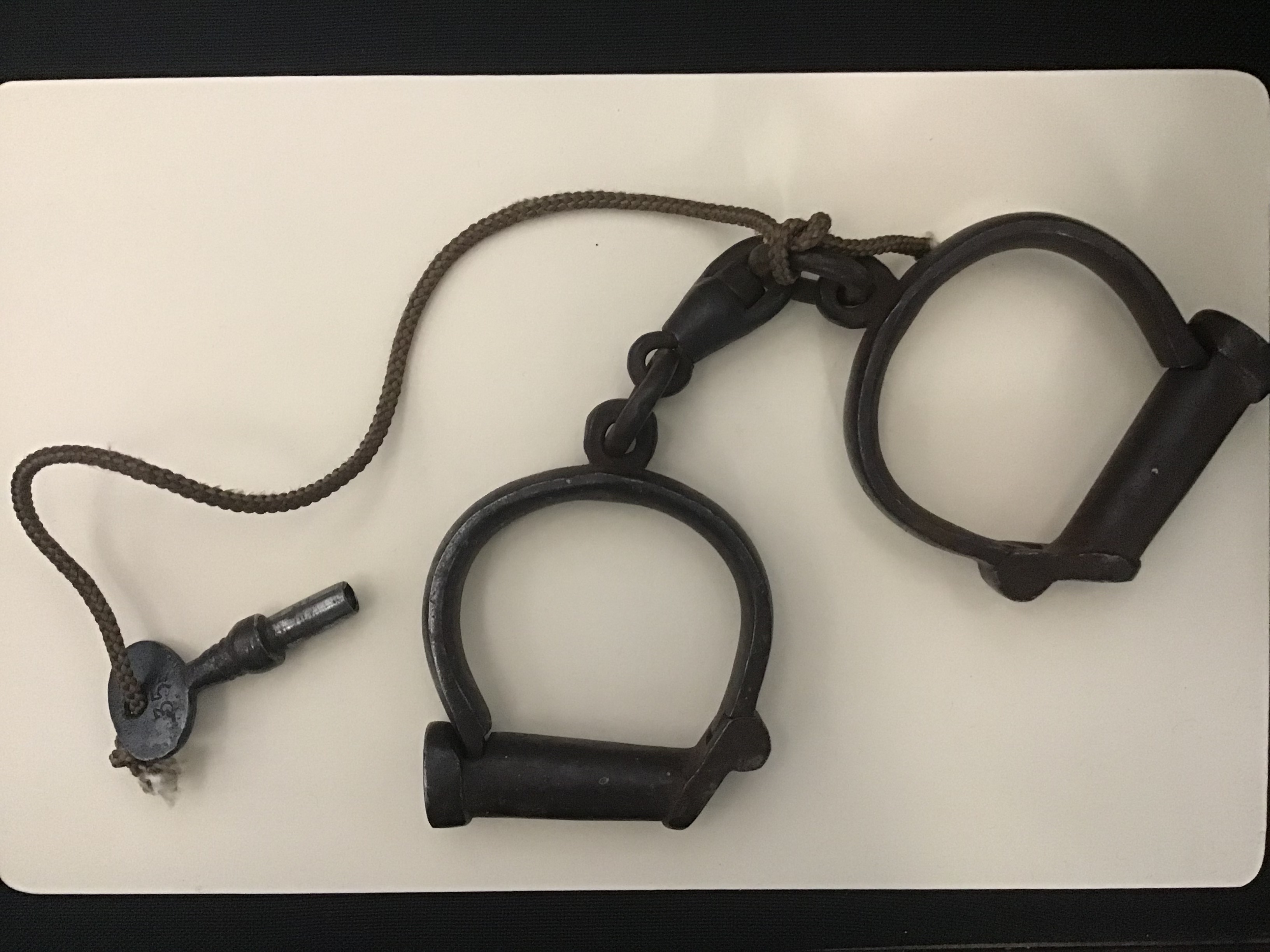 A pair of linked prison shackles with their key attached to them with a rope. The shackles originally belonged to Leslie Gilbert Brennan (Master Brennan's father). Donated to the library June 2014 by Master Janice Brennan.