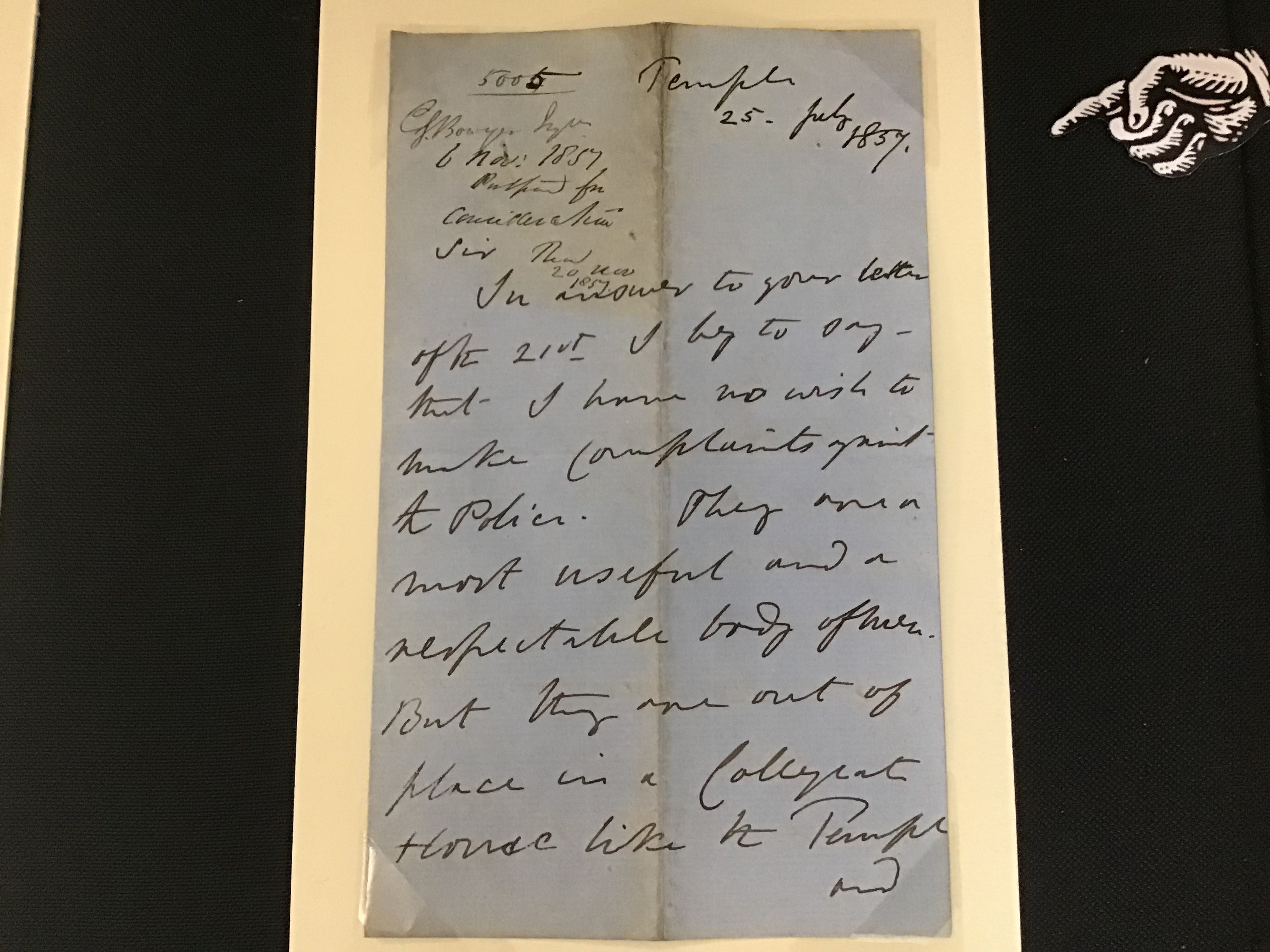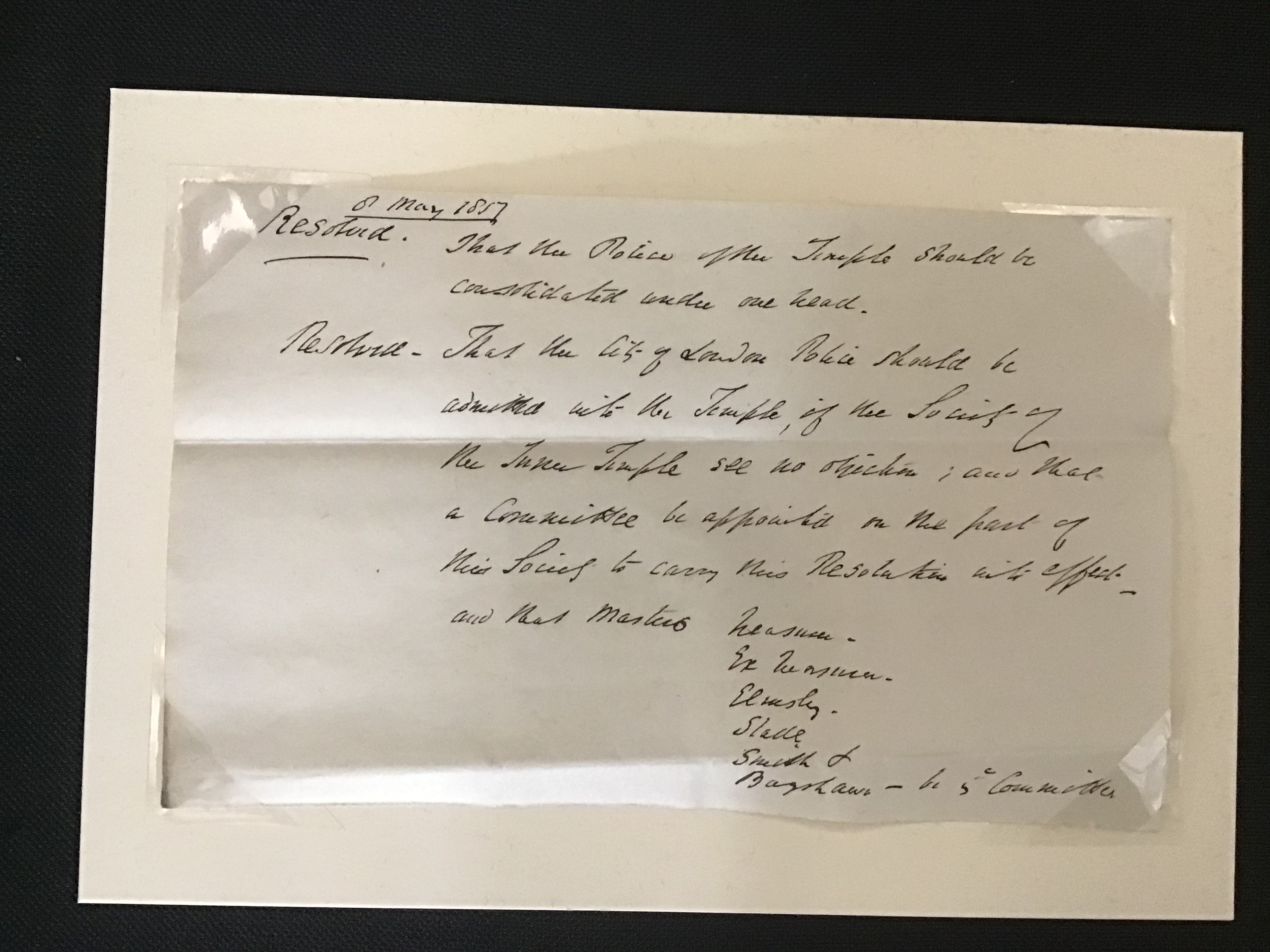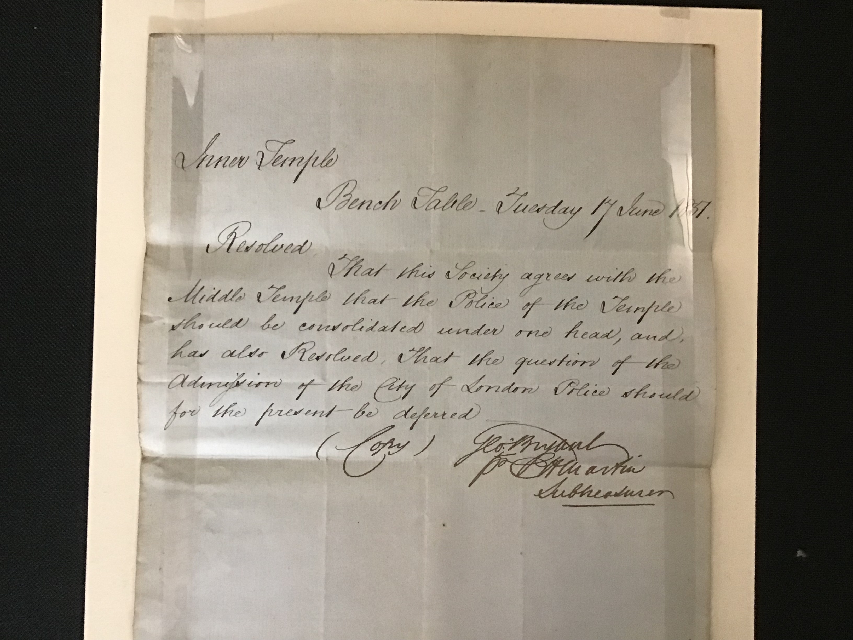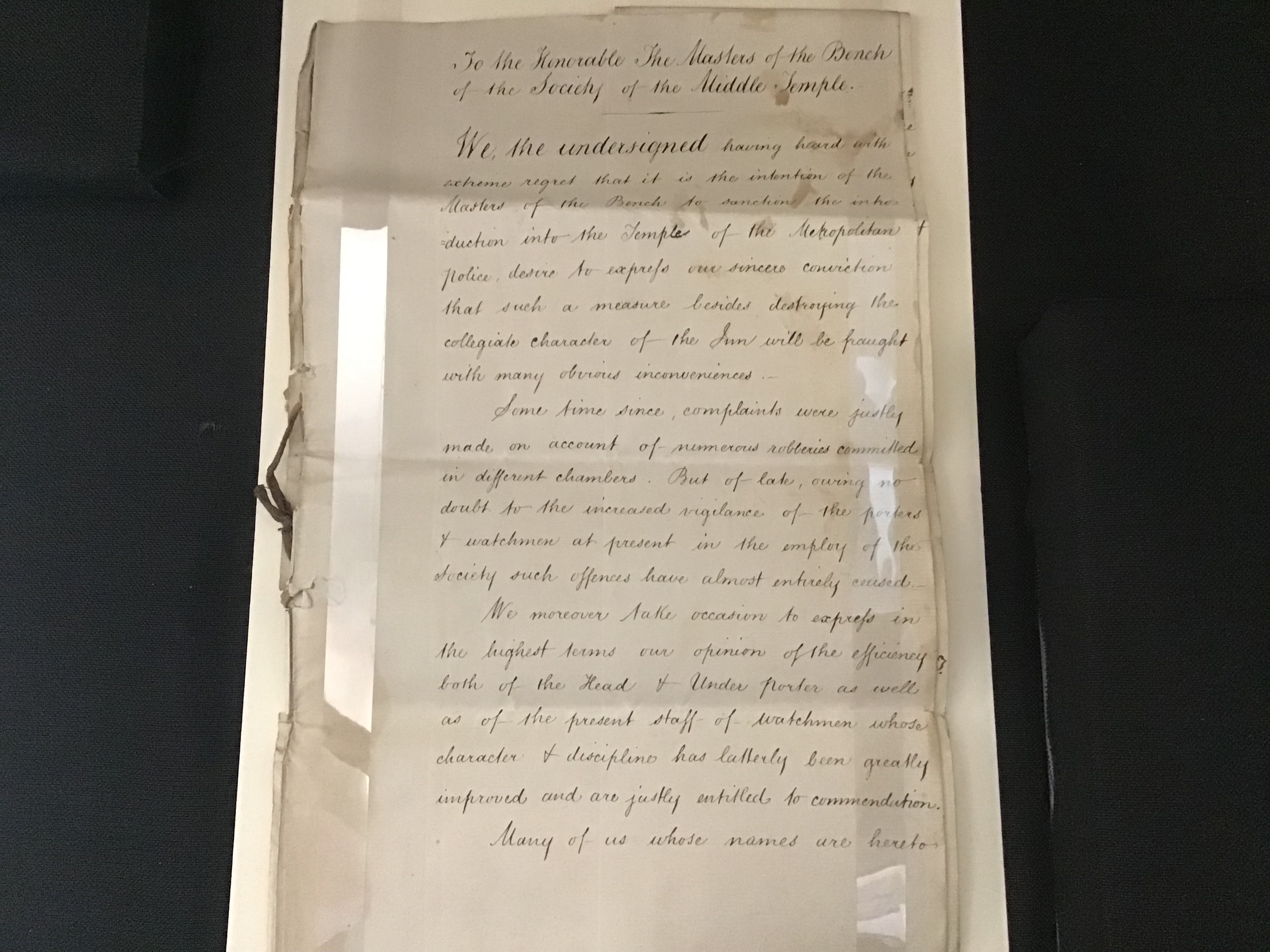 The introduction of the City Police to Middle Temple in 1857 was a contentious issue. The following documents on display are petitions and letters from members concerned by the introduction of the police to Middle Temple, expressing grave concerns about their purpose and presence.
