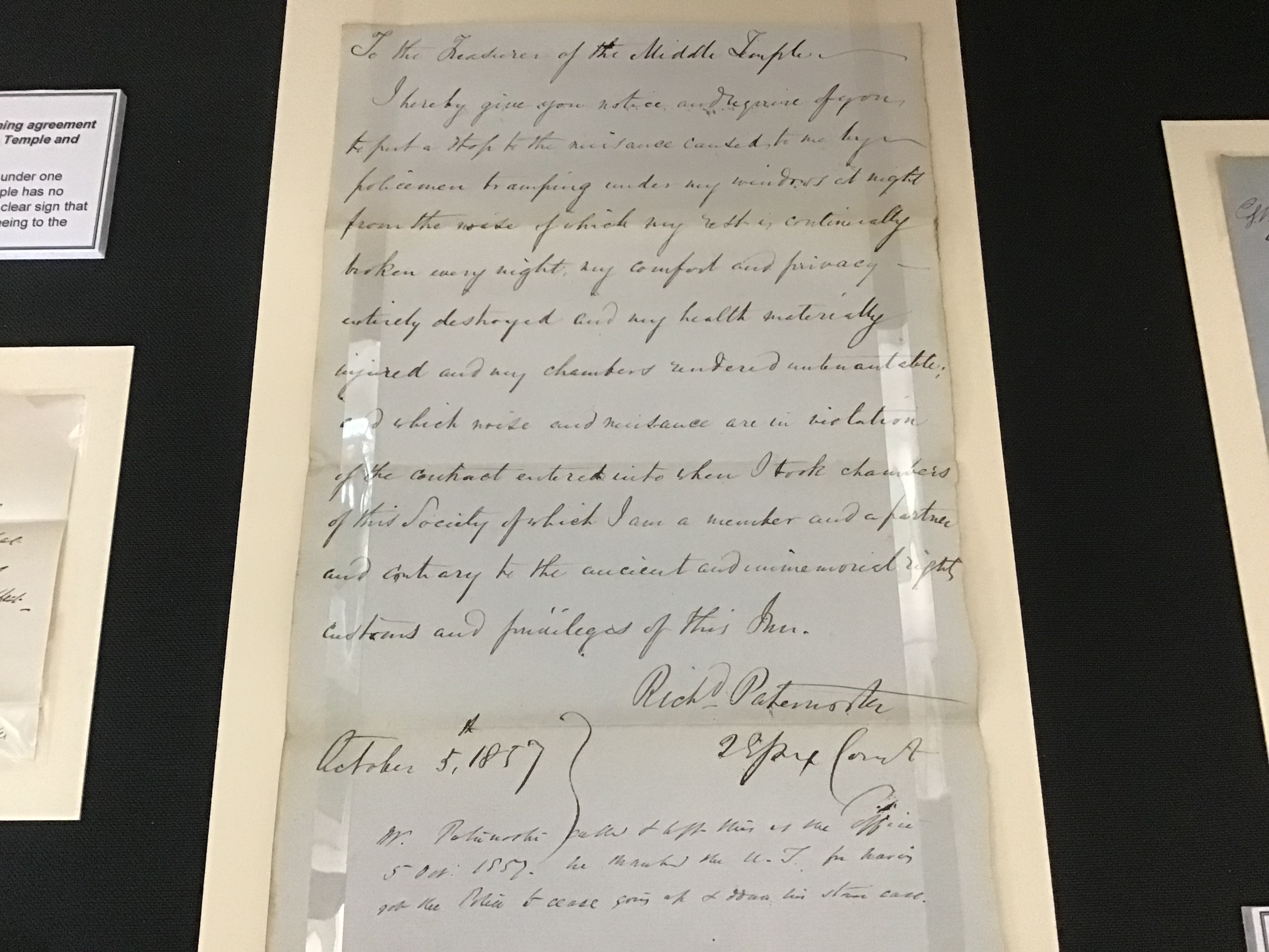 I hereby give you notice and require of you to put a stop to the nuisance caused to me by policemen tramping under my windows at night from the noise of which my rest is continually broken every night my comfort and privacy entirely destroyed and my health materially injured and my chambers rendered untenantable and which noise and nuisance are in violation of the contract entered into when I took chambers at this society of which I am a member and a partner and contrary to the ancient and immemorial rights customs and privileges of this Inn.