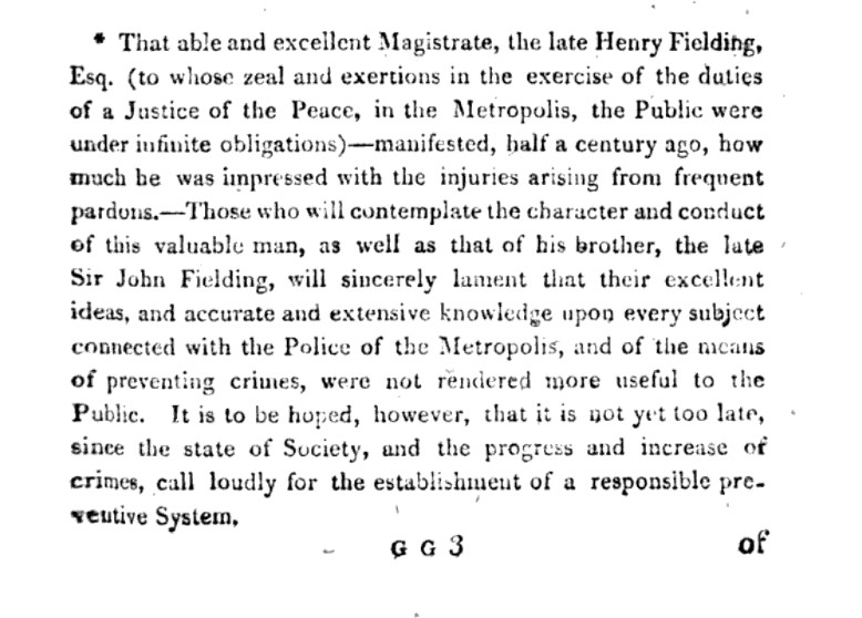Henry Fielding’s Enquiry – published in January 1751 – was written during his tenure as Bow Street Magistrate from 1748 until 1753.  Fielding was not only concerned with establishing a new system of policing, but was also focused on the long-term prevention of crime. This approach was commended by Patrick Colquhoun, who, in a footnote in his own Treatise of 1800, outlined that Fielding was both ‘able and excellent’ in his role as Justice of the Peace and for his work on ‘remedying this growing evil’ that had ‘manifested’ in London.