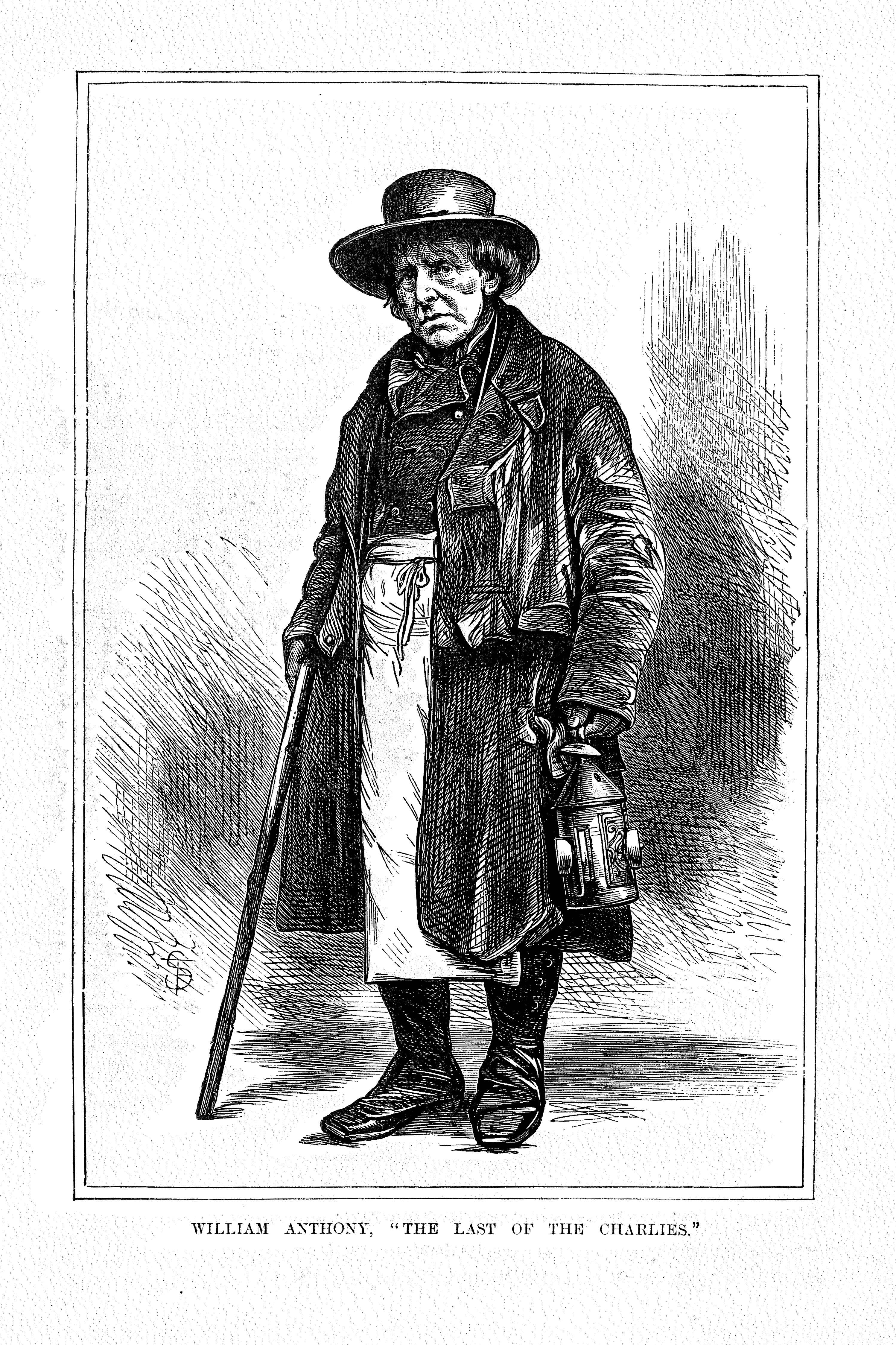 William Anthony was believed to be the last remaining Charlie, born in 1789 and patrolling Spitalfields and Norton Folgate for 50 years until his death in 1863. He was regarded as an effective and determined presence, recording an unbroken sequence of ‘All’s Well’ throughout his tenure.